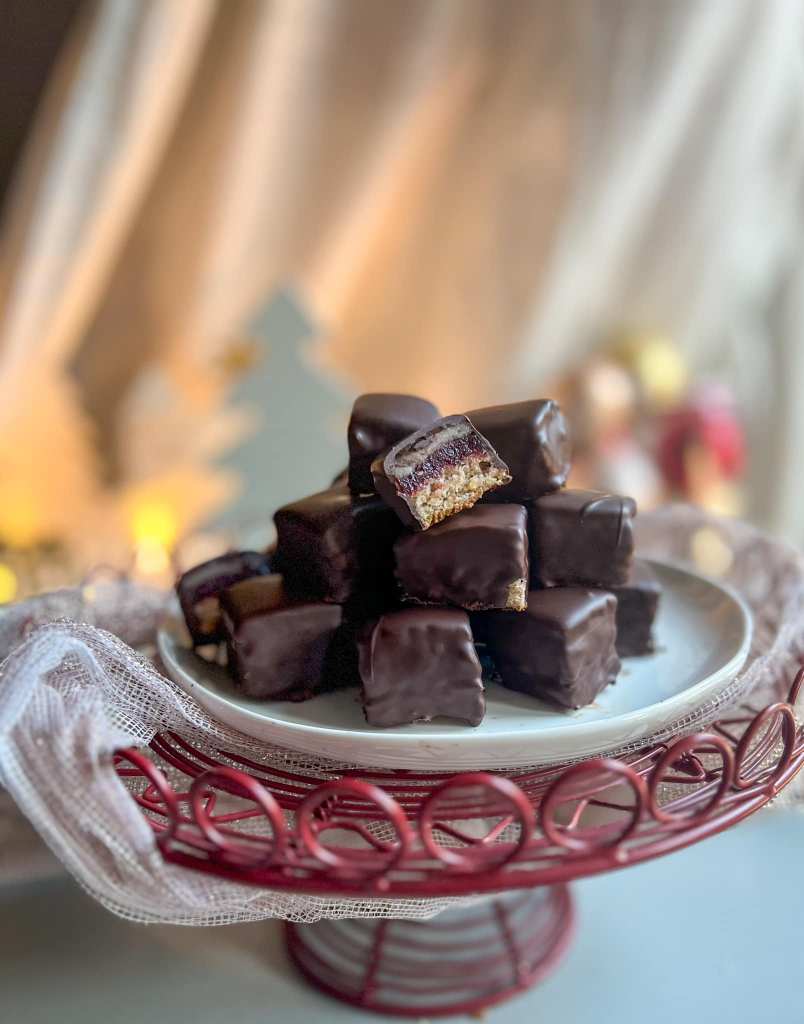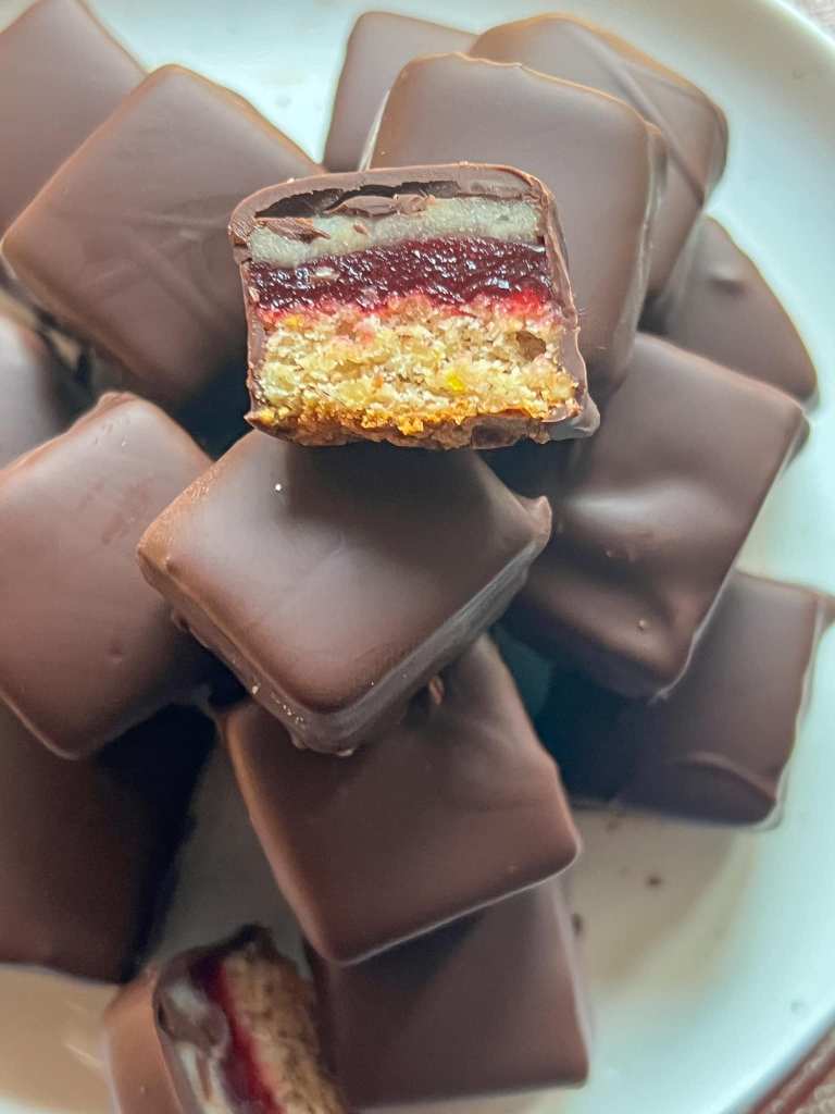 a piskóta. Nagyon jól áll neki, nekem jobban is ízlik mint a bolti verzió, sőt az eredetotől is jobb, mert azt is elkészítettem. Gazdag, mézes piskóta, savanykás ribizli lekvár és egy marcipán réteg, csokiba mártva. ÁLOM!